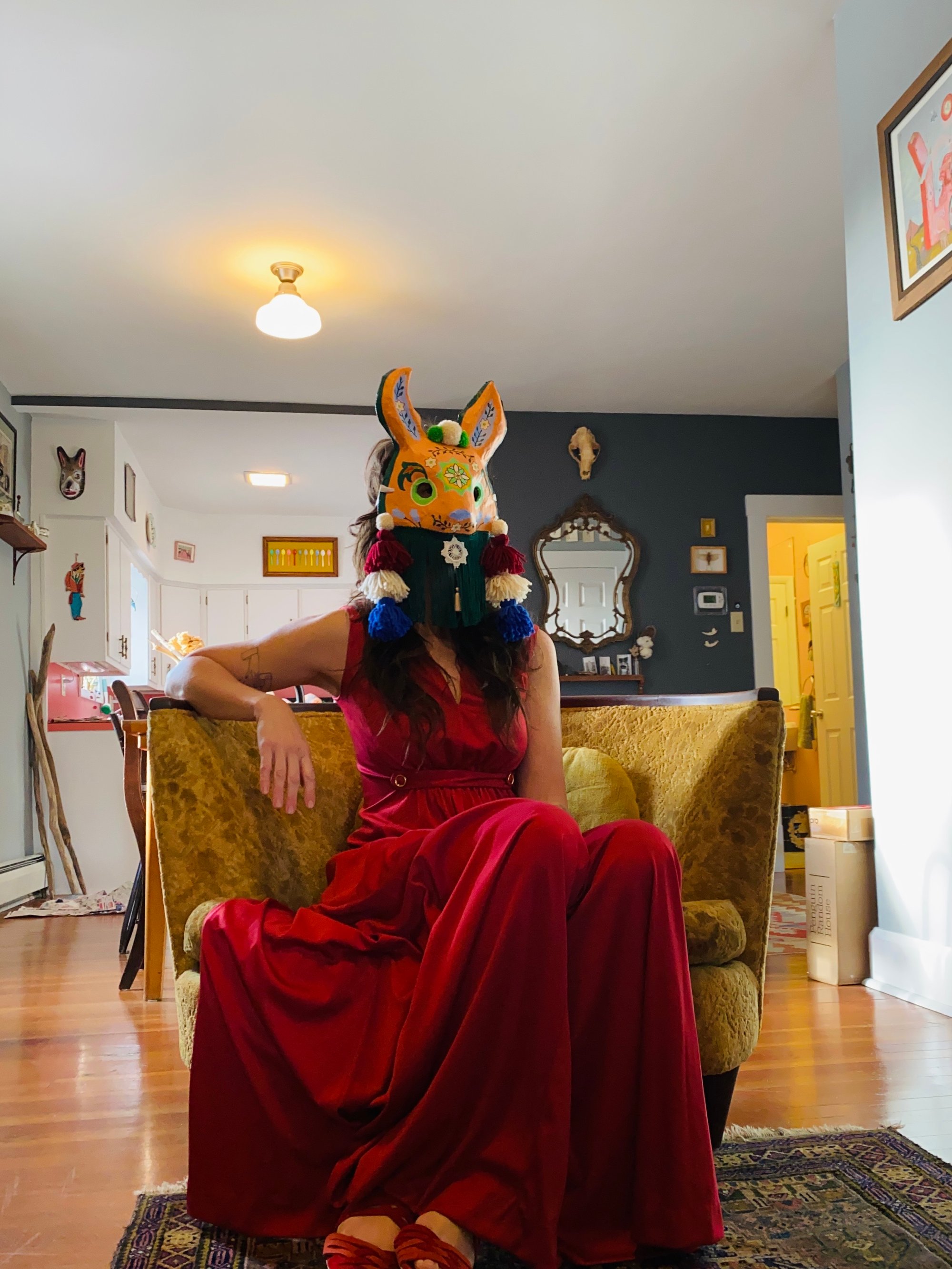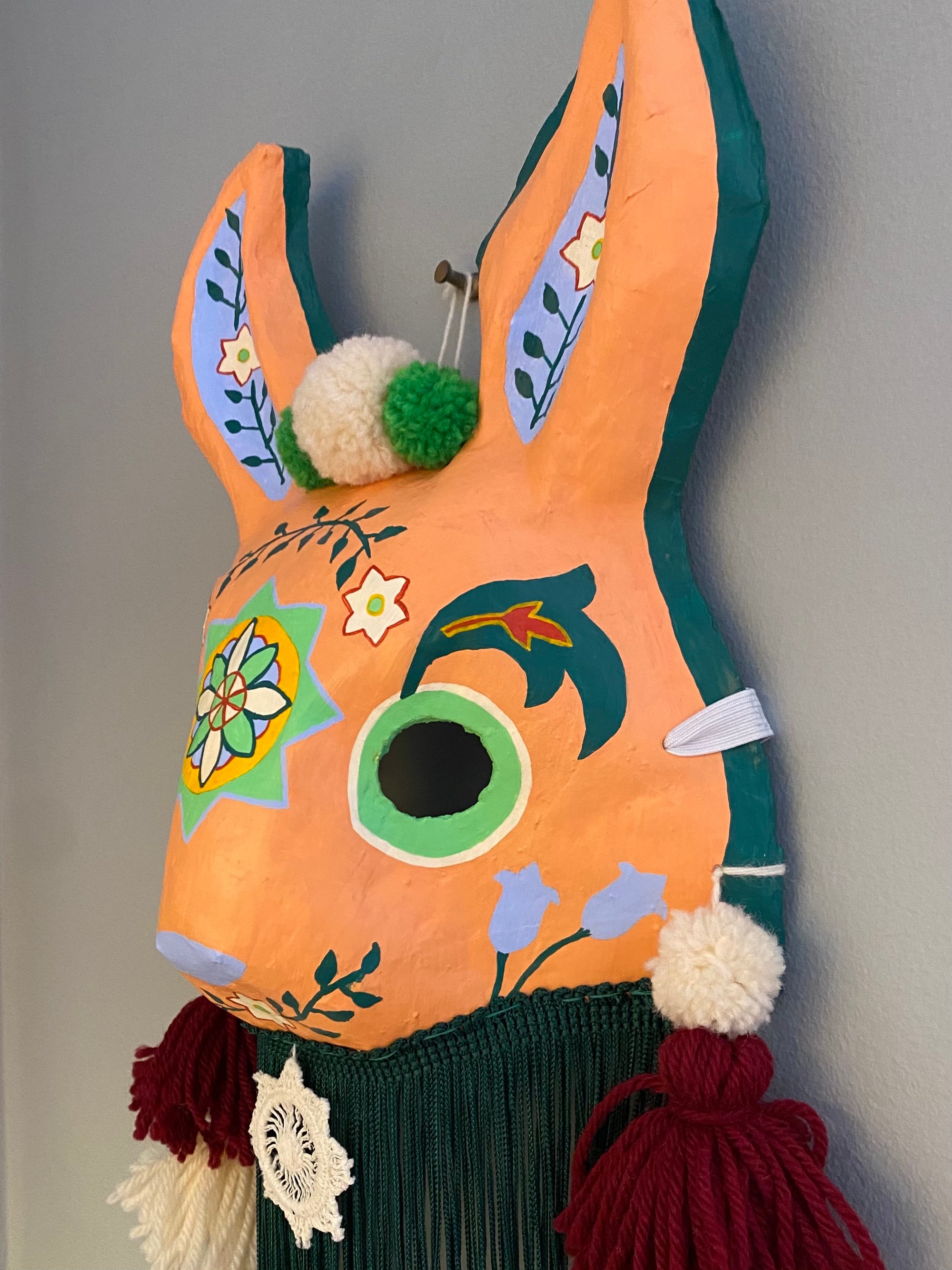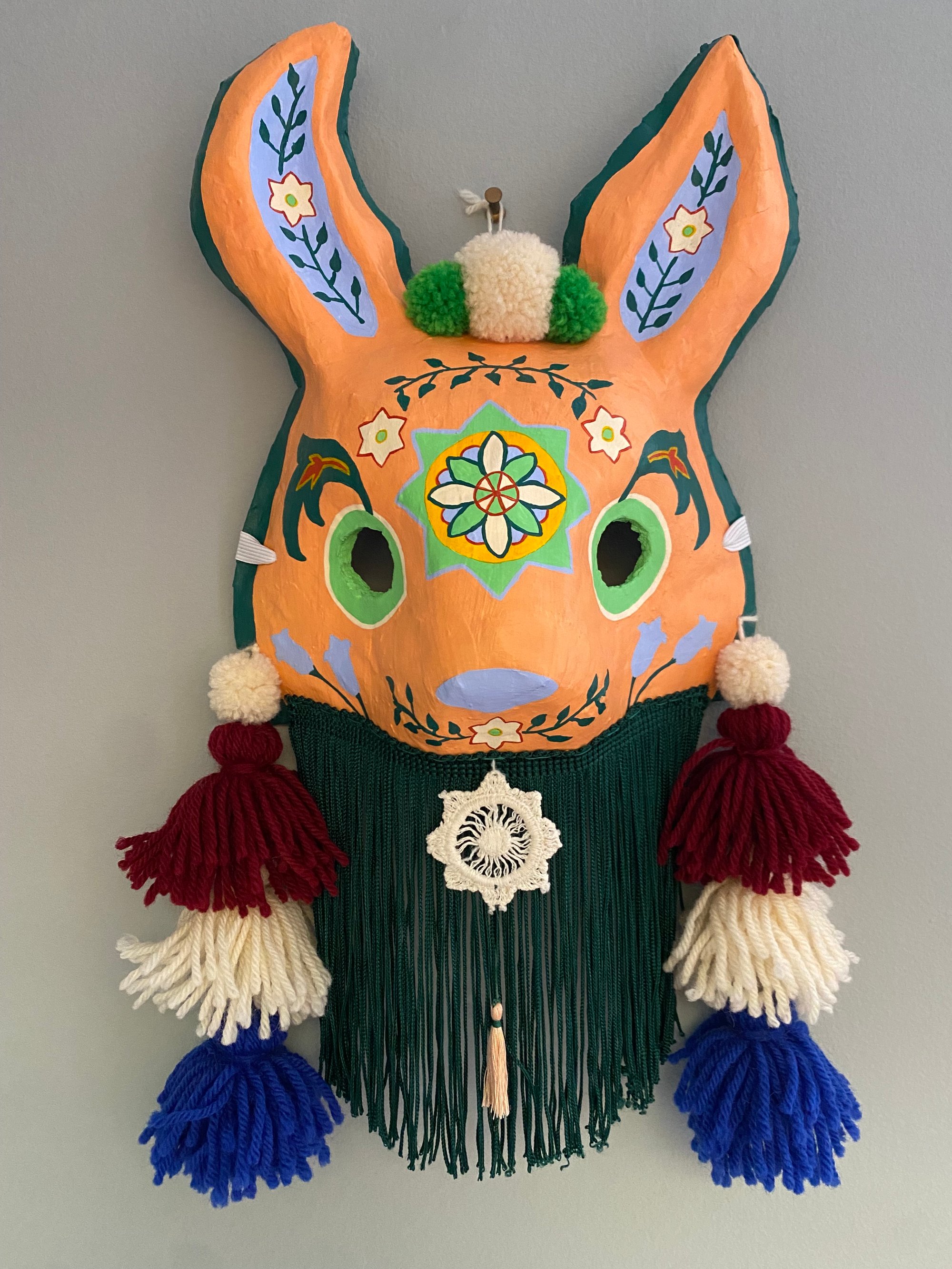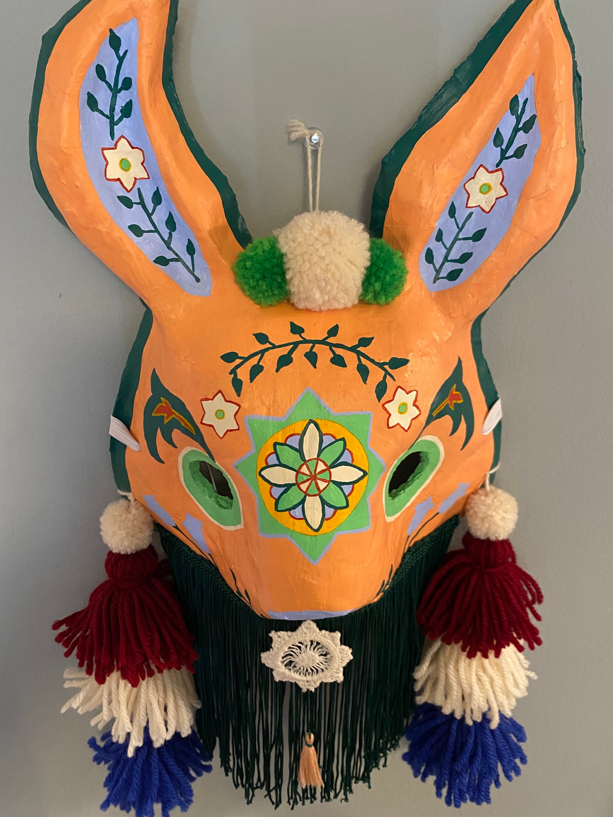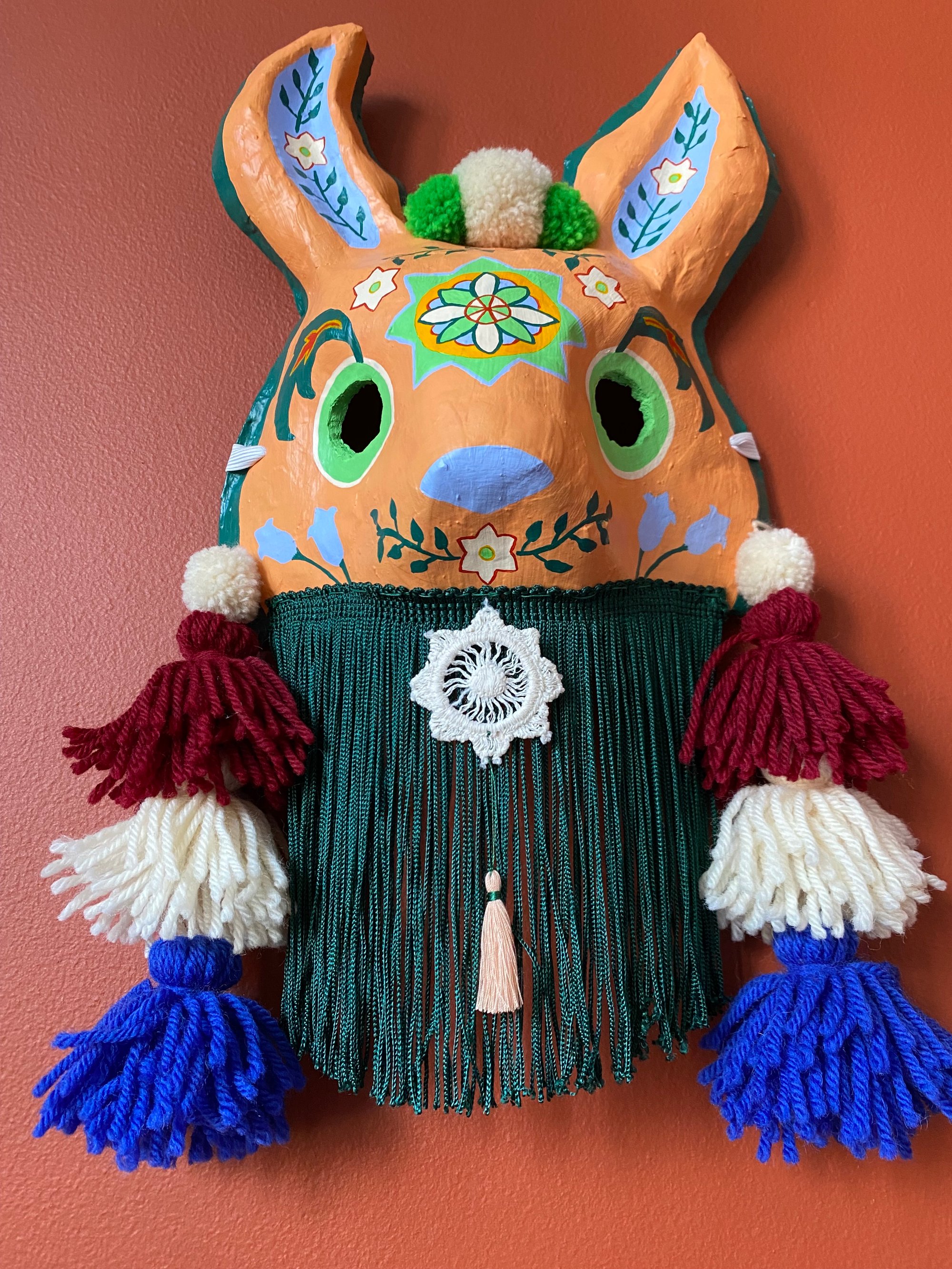 Folk art mask constructed of papier-maché, acrylic paint, handmade wool tassels & pom-poms, vintage tatted lace, and rayon fringe. This wearable good luck talisman has a loop for hanging on a wall in your home. ✨