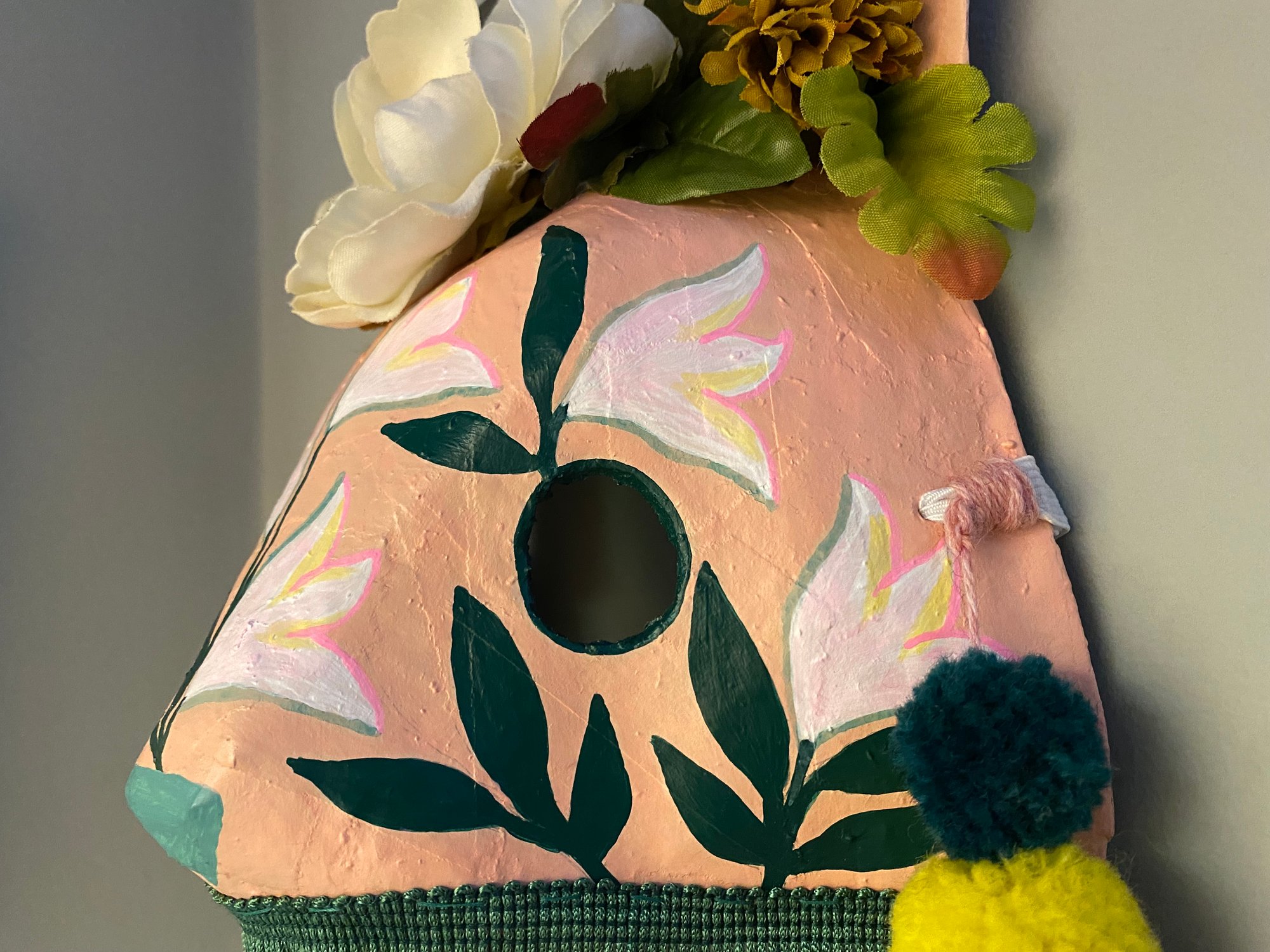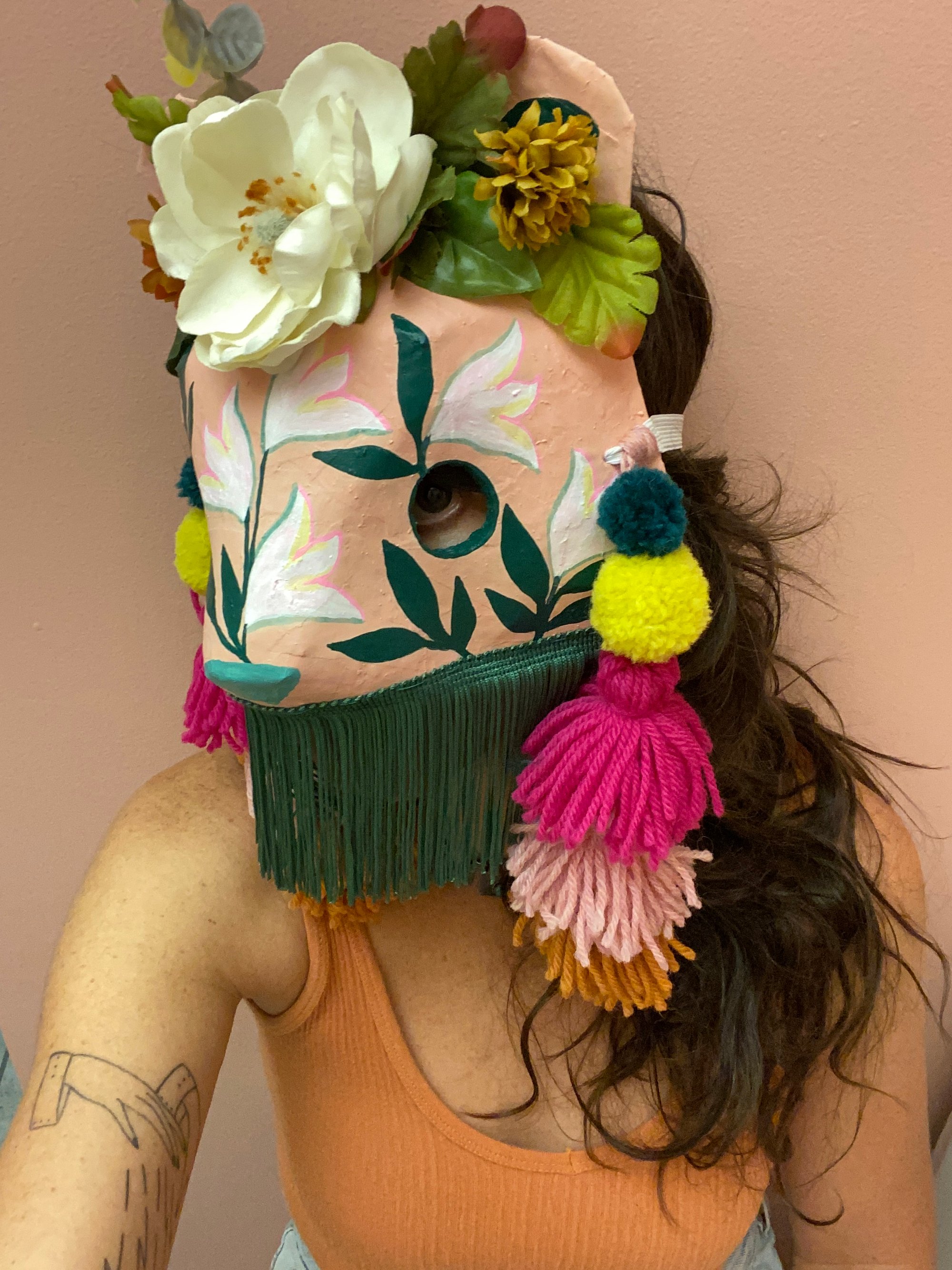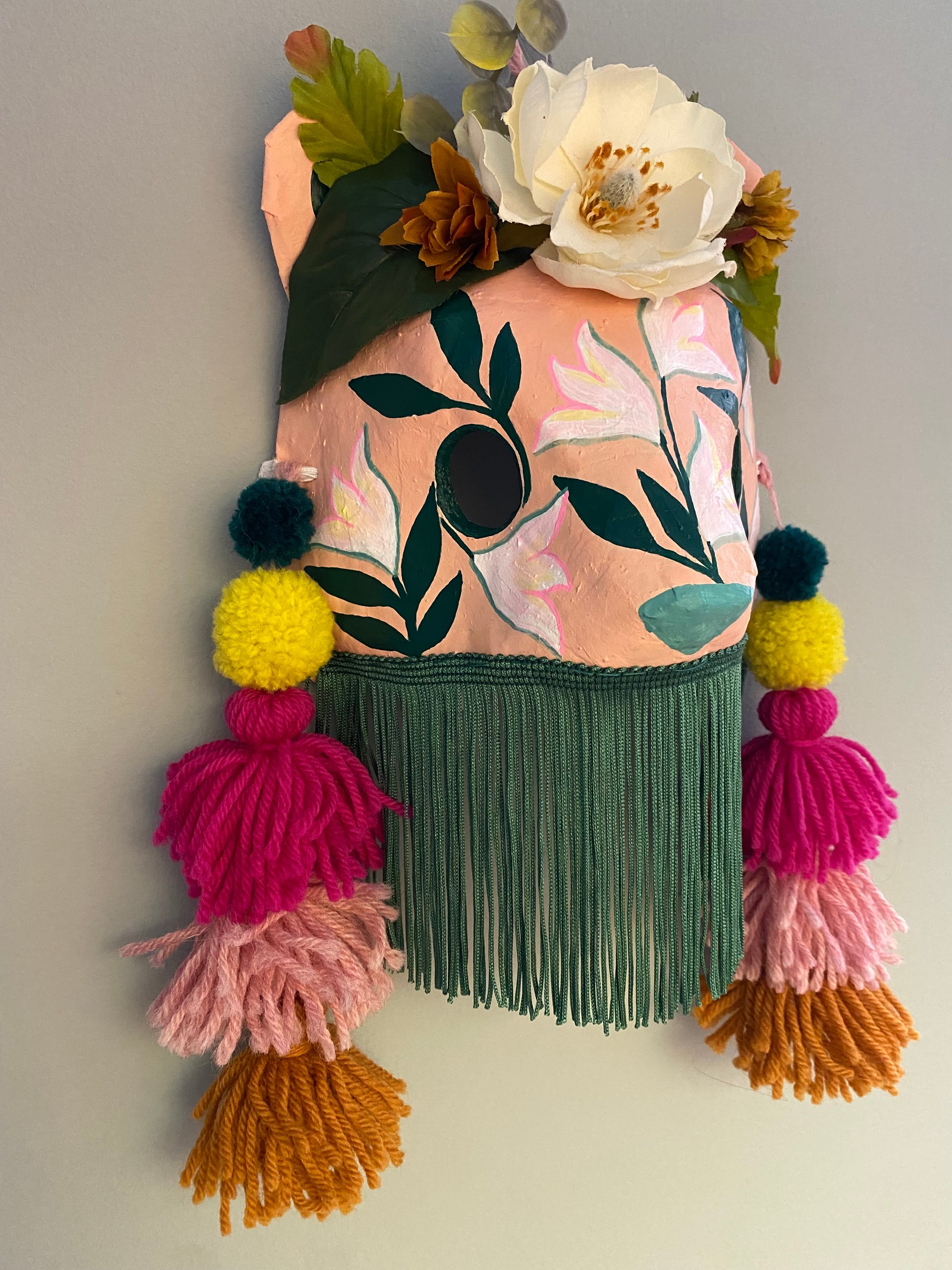 Folk art mask constructed of papier-maché, acrylic paint, handmade wool tassels & pom-poms, vintage flowers and leaves, and rayon fringe. This wearable good luck talisman has a loop for hanging on a wall in your home. ✨🕯🌸🌪 She's got heart of magnolia and soul of hurricane.