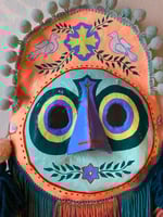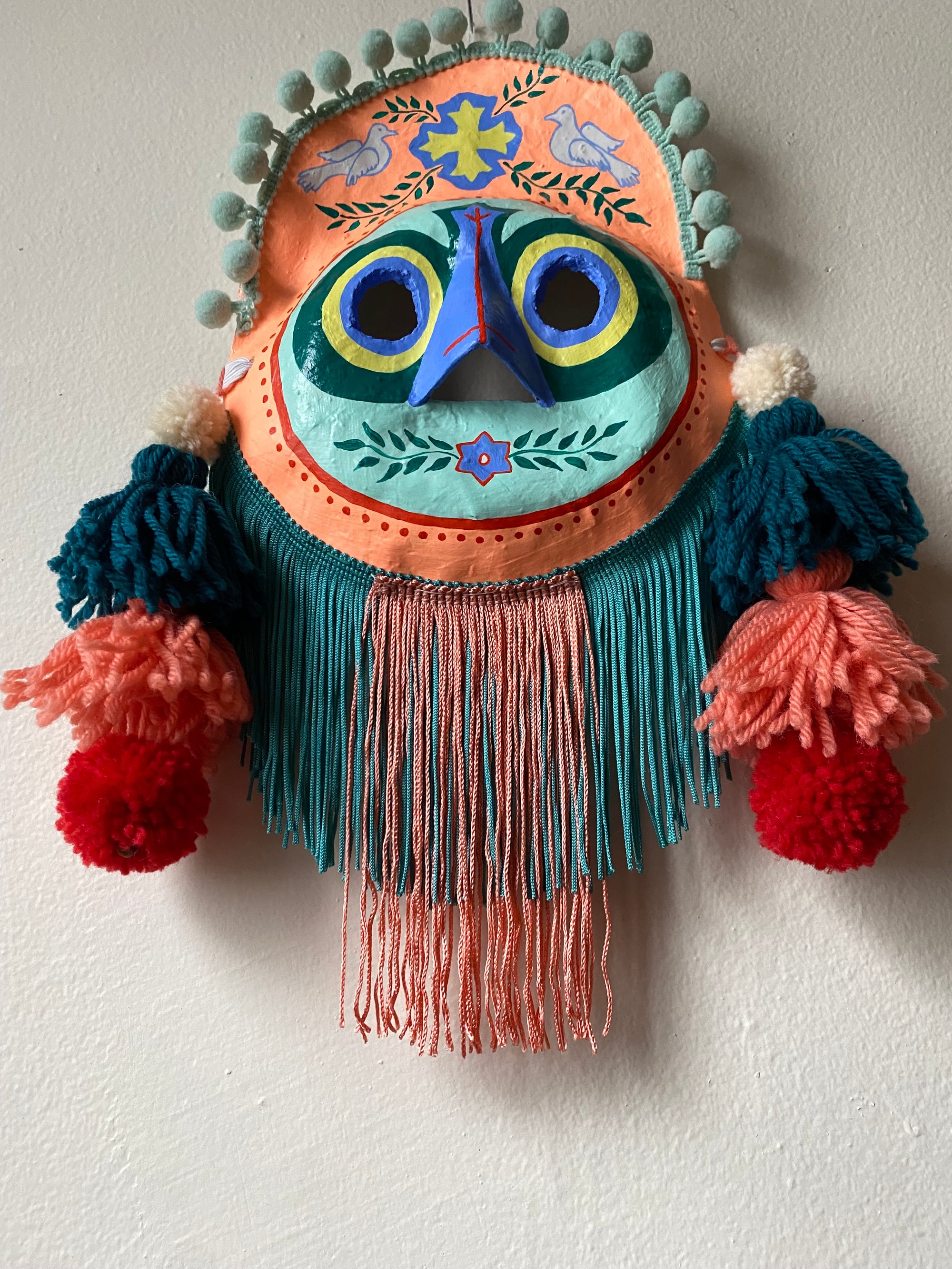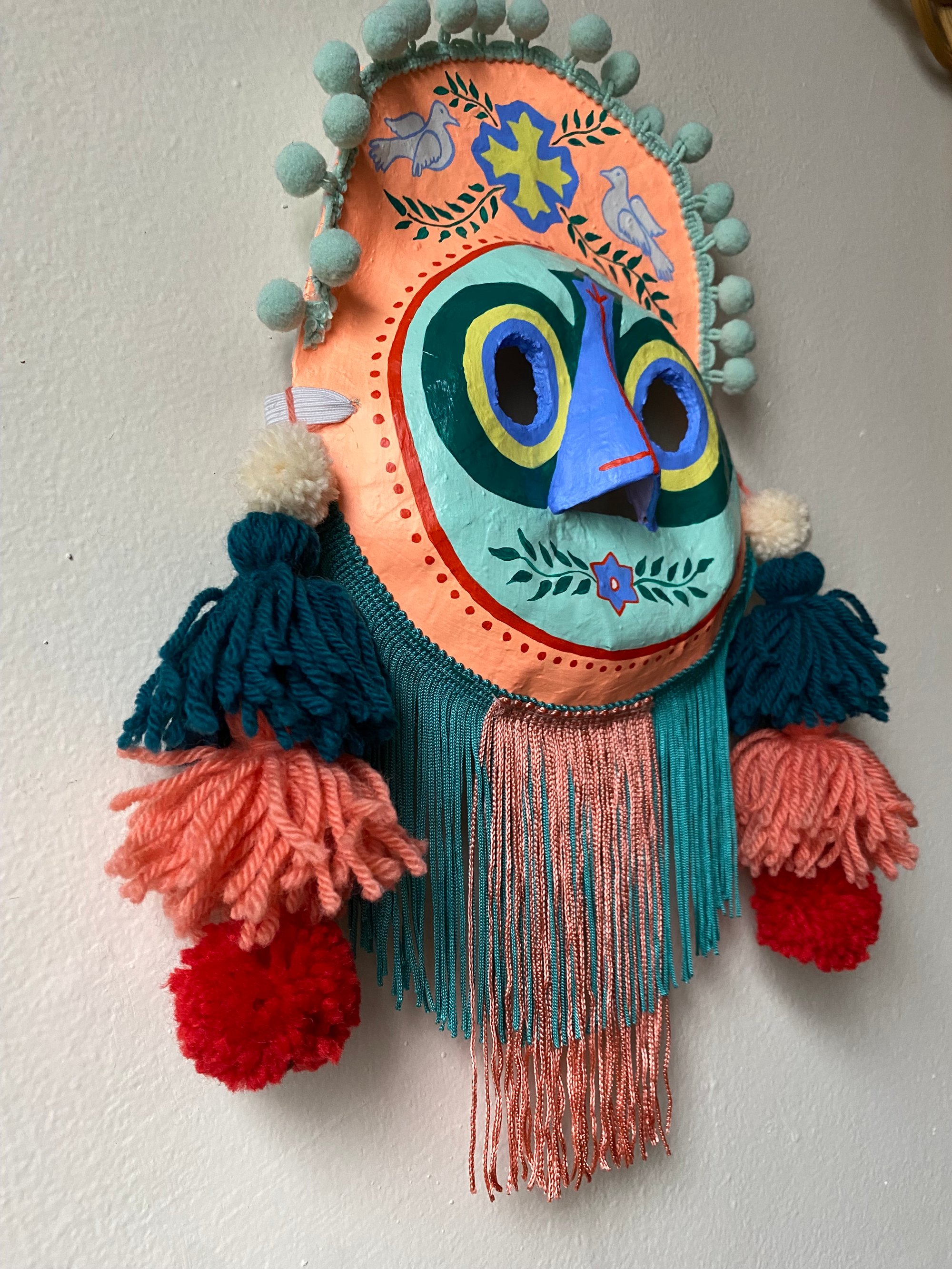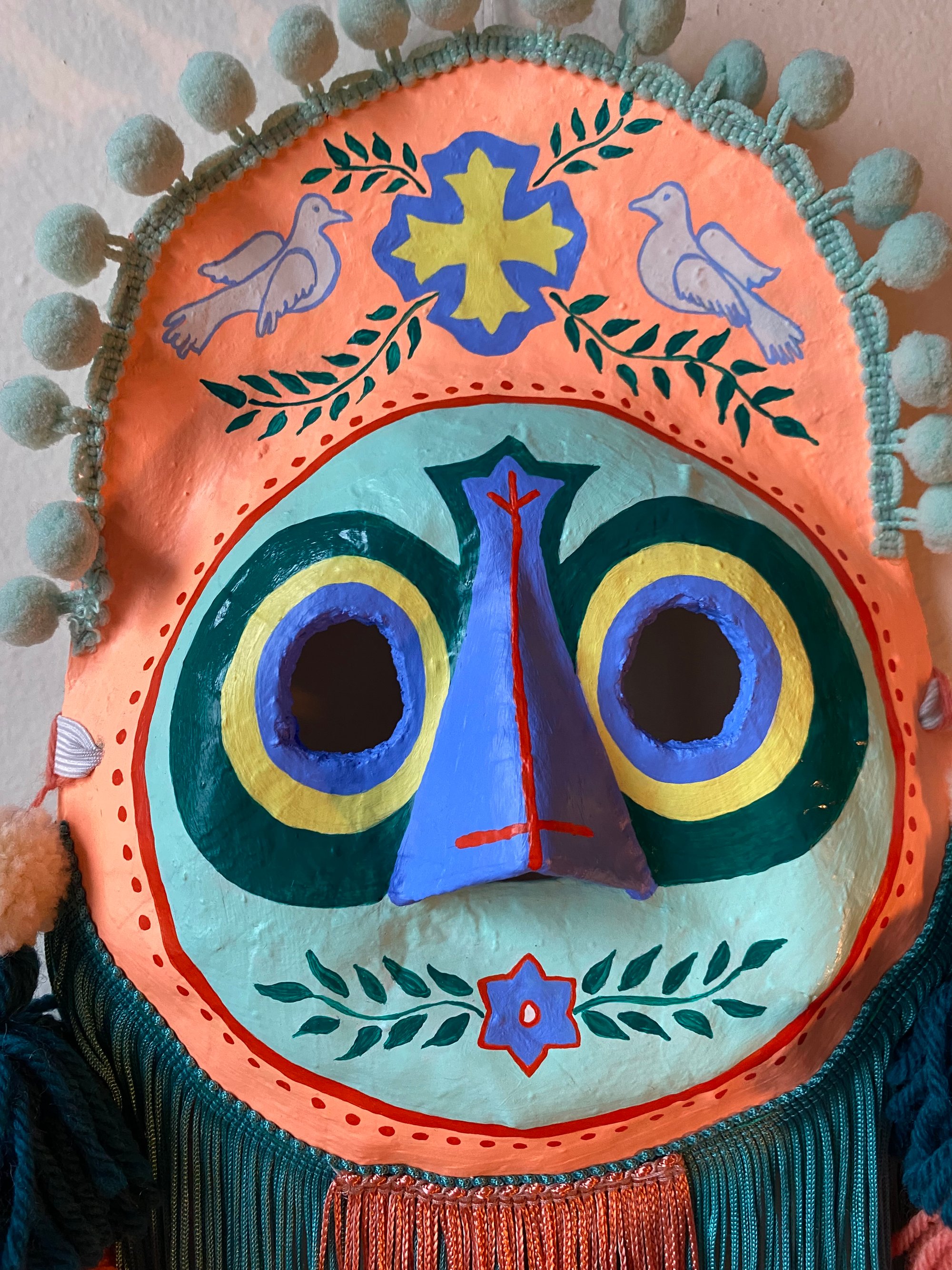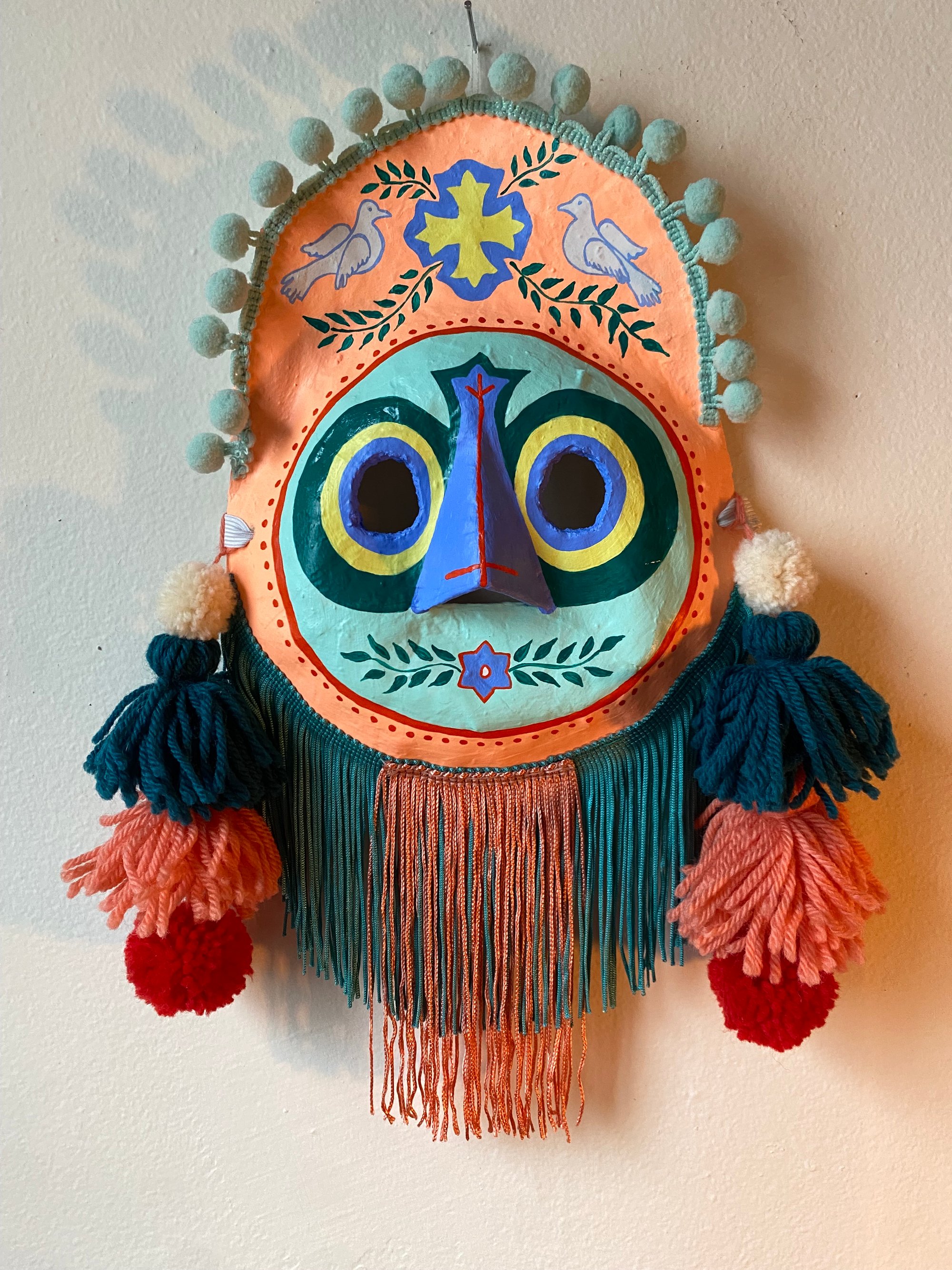 Folk art mask constructed of papier-maché, acrylic paint, handmade wool tassels & pom-poms, and rayon fringe. This wearable good luck talisman has a loop for hanging on a wall in your home. ✨