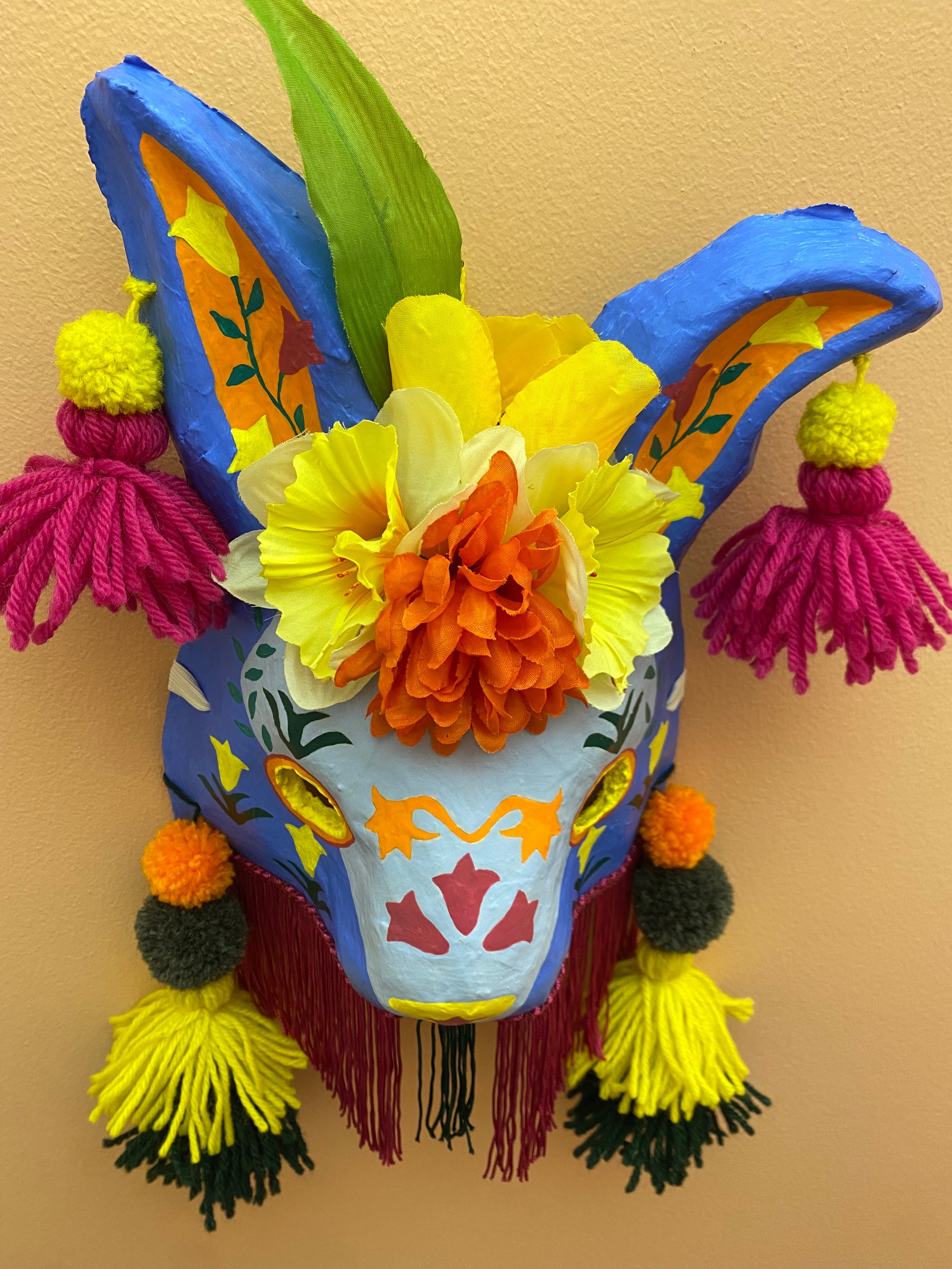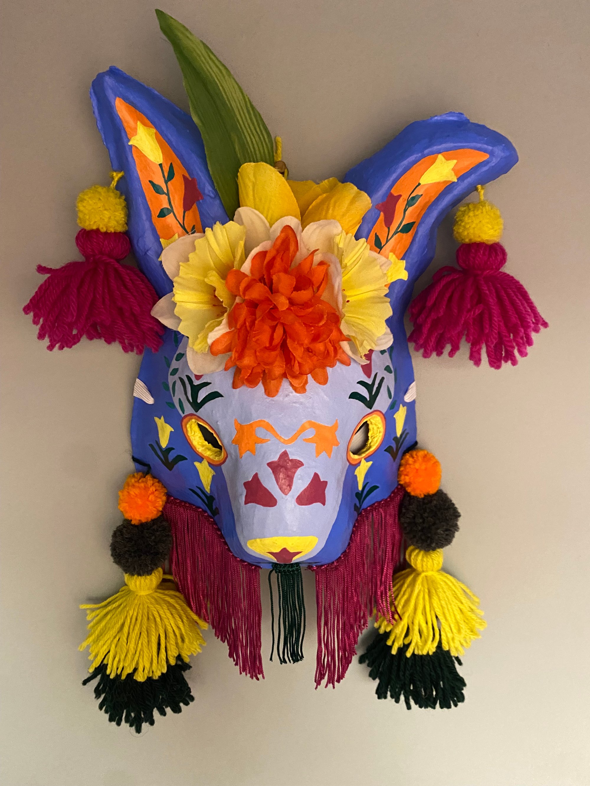Folk art mask constructed of papier-maché, acrylic paint, handmade wool tassels & pom-poms, vintage flowers and leaves, and rayon fringe. This wearable good luck talisman has a loop for hanging on a wall in your home. 🌕🐇🌷💫🌲