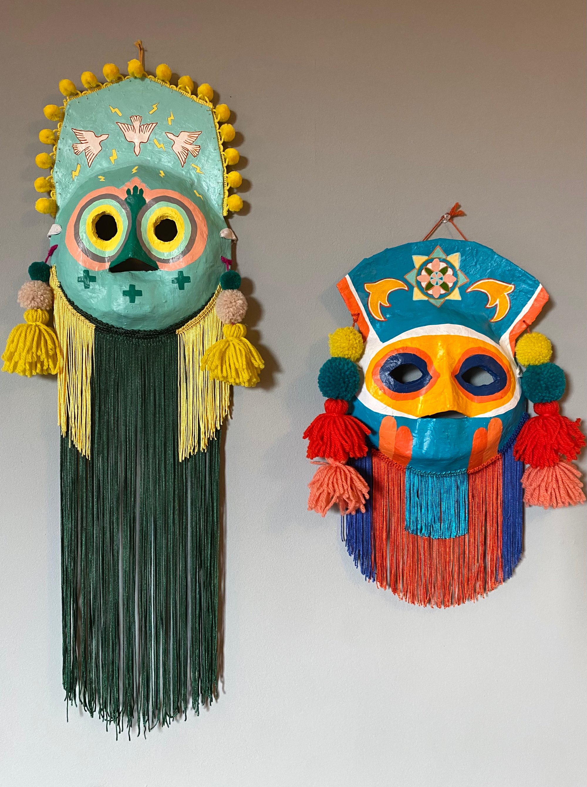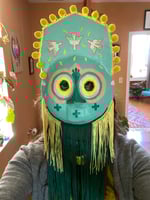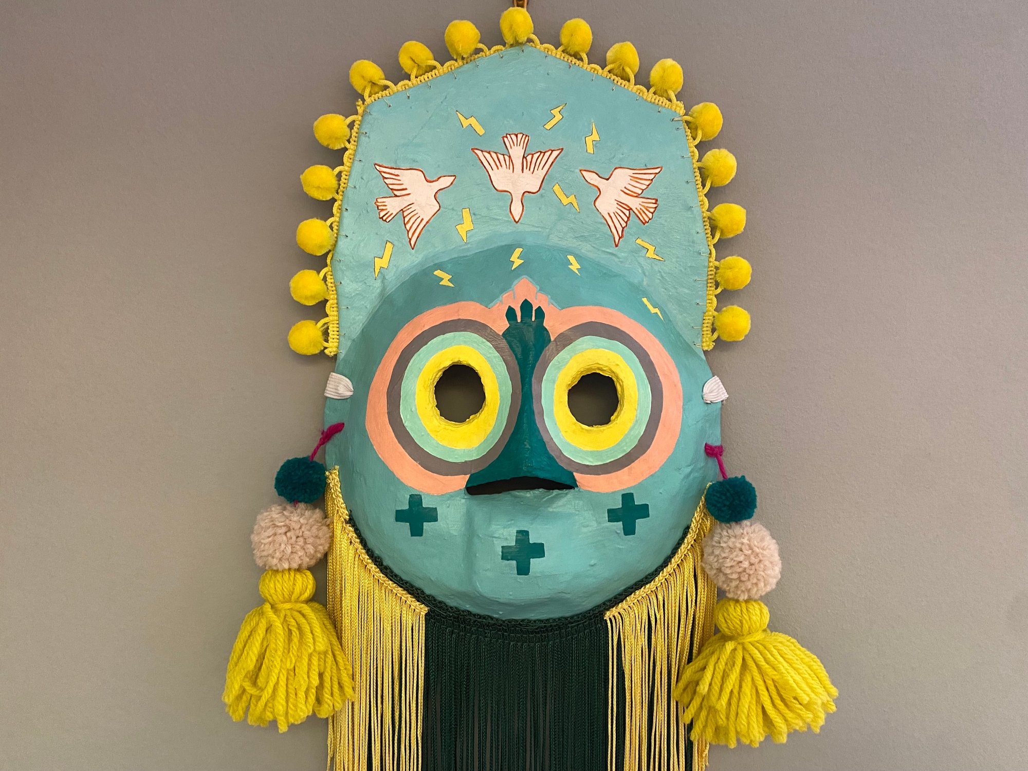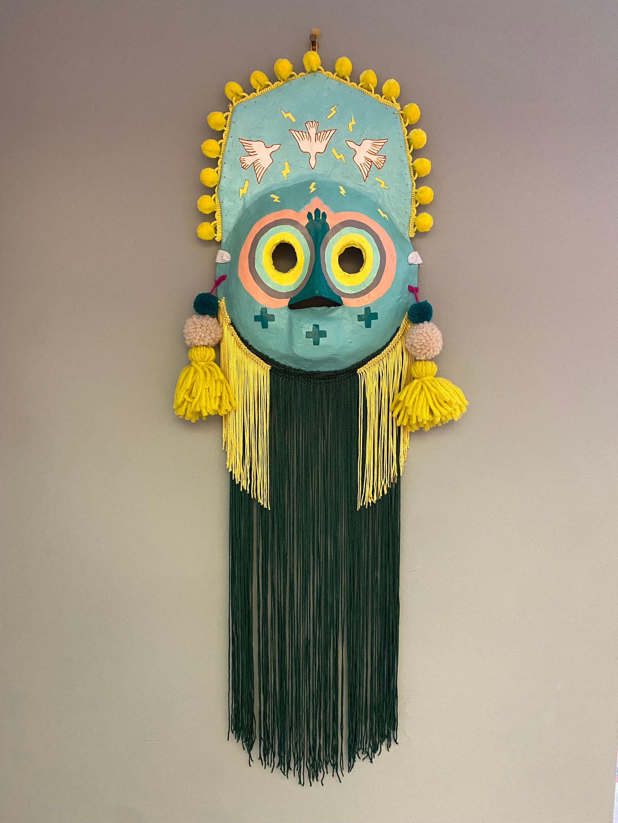 Folk art mask constructed of papier-maché, acrylic paint, cotton pom fringe, handmade wool tassels & pom-poms, and extra long rayon fringe. This wearable good luck talisman has a loop for hanging on a wall in your home. Patron saint of flying high… don't weep for icarus, he saw what he saw. ✨🙏🏼✨