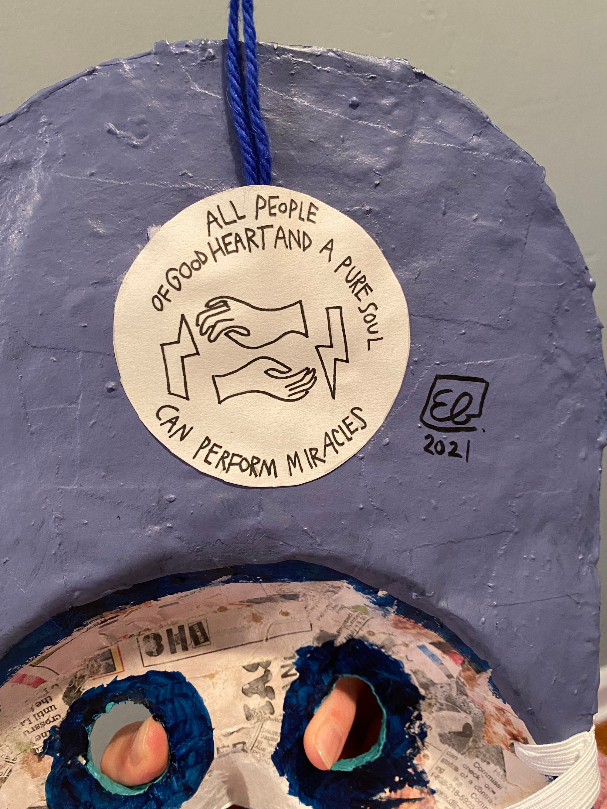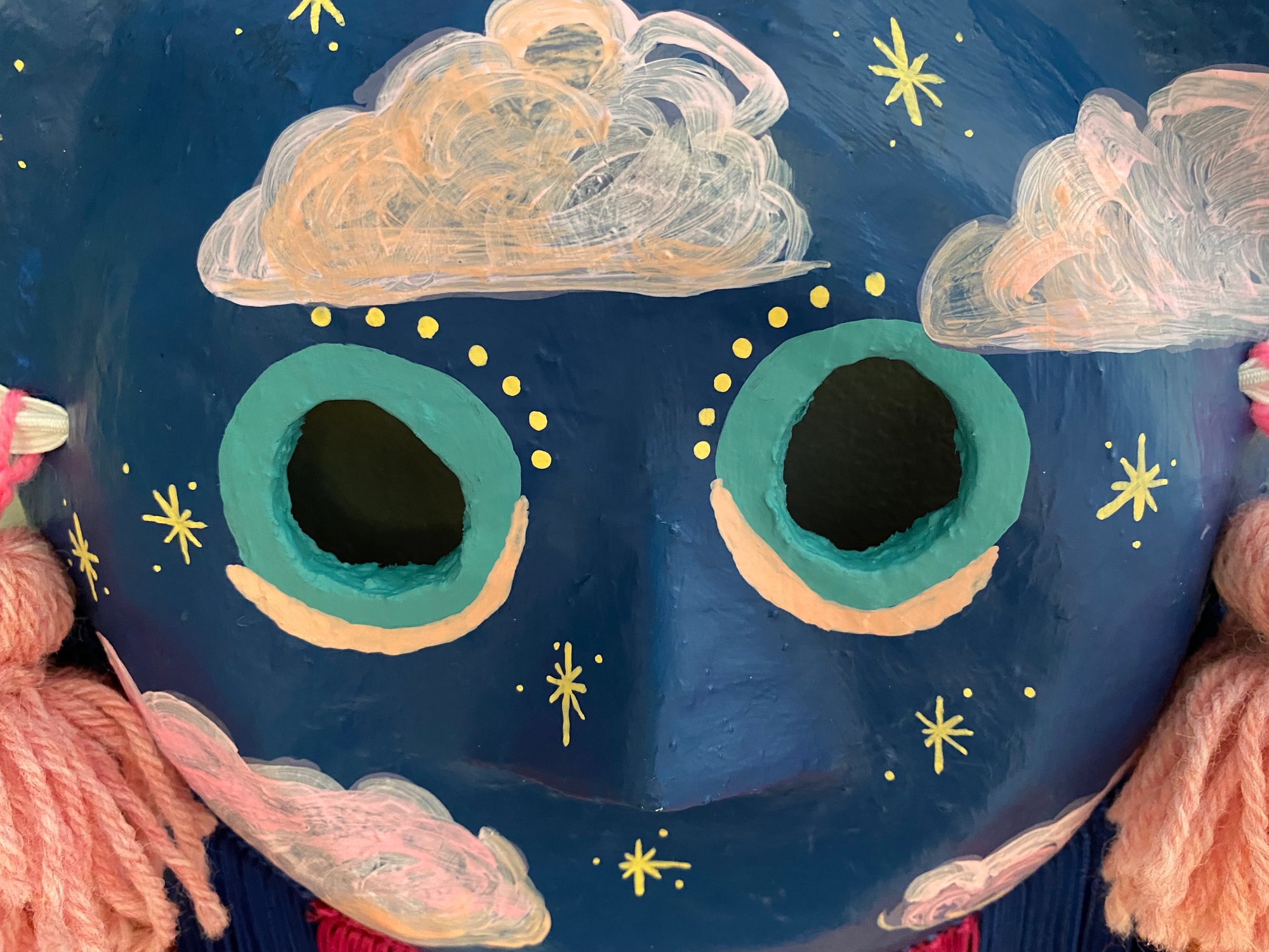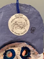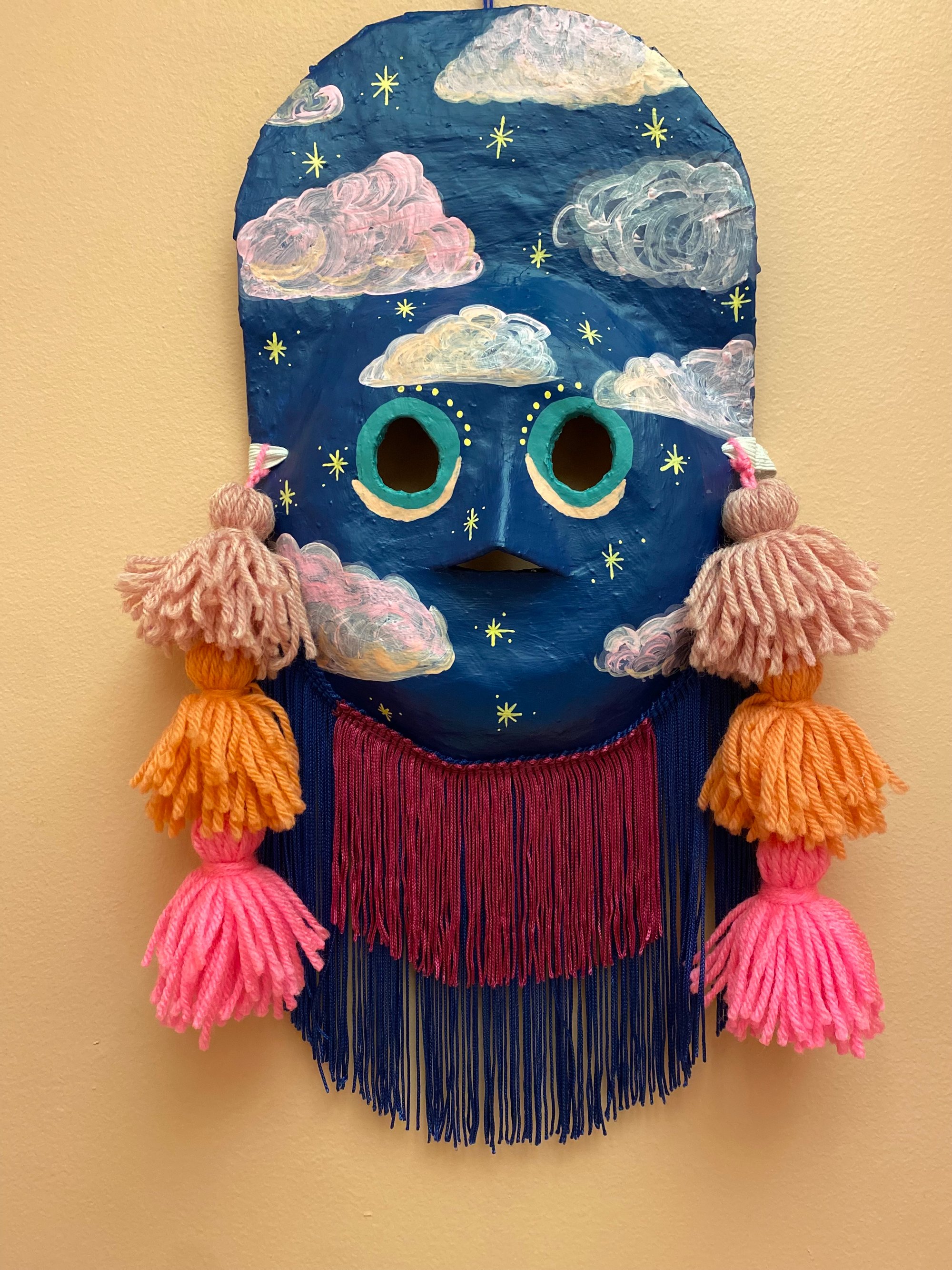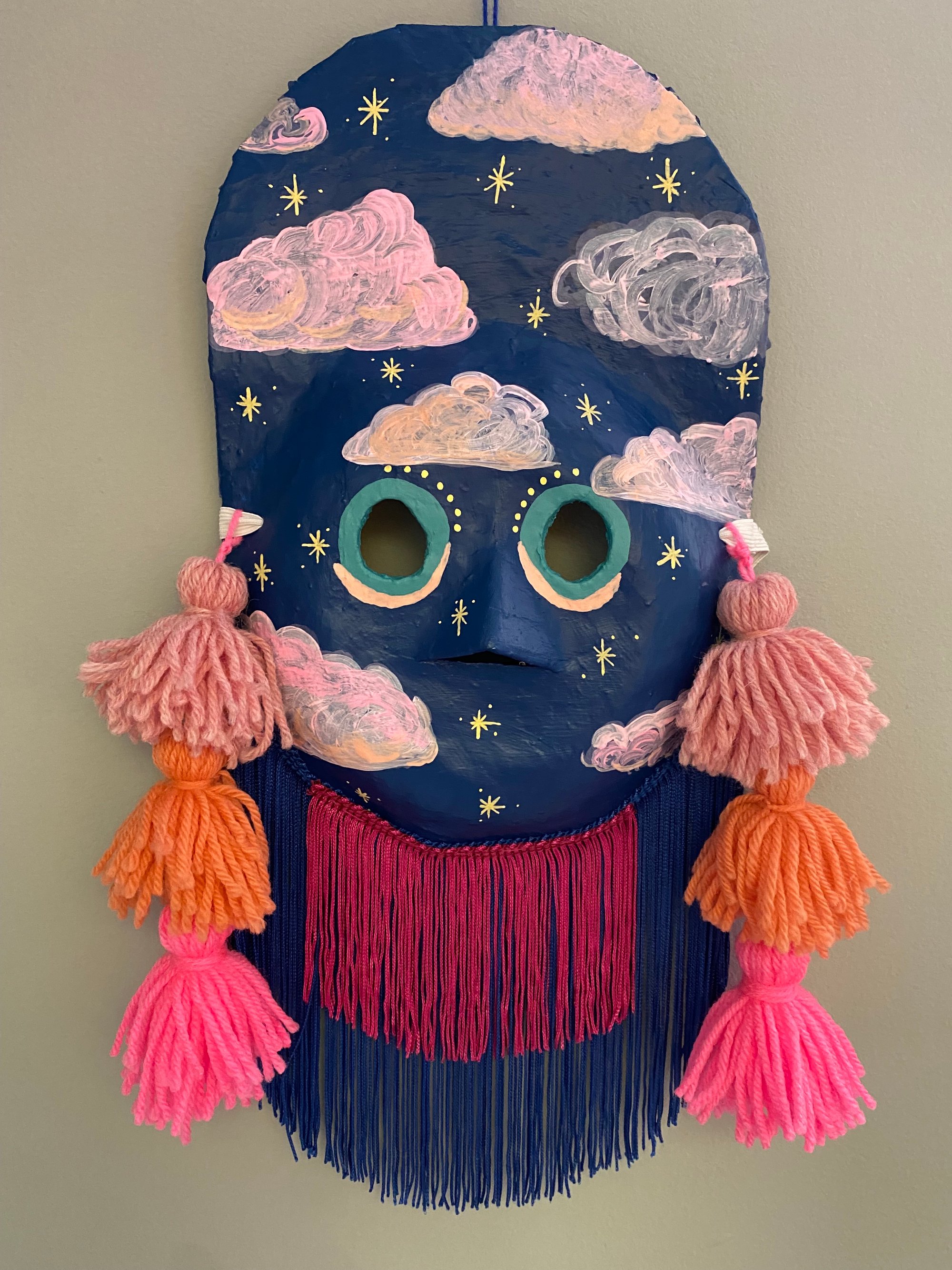 Folk art mask constructed of papier-maché, acrylic paint, handmade wool tassels and rayon fringe. This wearable good luck talisman has a loop for hanging on a wall in your home. Your invitation to living in the moment where the sun and moon are both out, rsvp no regrets.
